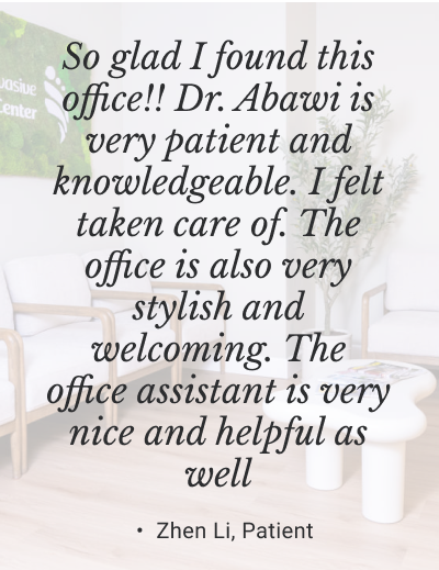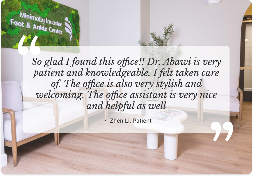 Posted on Miriam DavisTrustindex verifies that the original source of the review is Google. Dr Abawi saved my right foot. She is aggressive with her treatments and she cares about her patients!!! I am a type 2 diabetic and had to have my second toe amputated because of gangrene and the podiatrist that preformed that surgery, left loose tendons in my foot which became infected. My vascular doctor, Dr Gupta, referred me to Dr Abawi and that is the best π decision I've ever made. I love her and have nothing but respect π and confidence that she's taking care of me. She's my podiatrist FOR THE REST OF MY LIFE. If you are having issues with your feet and legs, MAKE SURE YOU MAKE AN APPOINTMENT AND PUT YOUR FAITH AND TRUST IN DR ABAWI π π ALSO, I GIVE A BIG SHOUT OUT TO CRYSTAL!!! SHE'S THE BEST π π π π₯°. Whenever I see her, she's so positive and attentive. She cried with me when I found out that I had to have a second toe amputated. She really connects with her patients!!! LOVE YOU CRYSTAL π β€οΈ. I can go on and on regarding the care that I have received from Dr Abawi, she not only amputated my third toe, but my diabetes was accompanied with p.a.d., therefore, the circulation to the front of my foot was not there. Dr Abawi, performed a TMA on my right foot. TMA means that I have no toes on my right foot. However, I am doing great π π π. Like I said, she's saved the rest of my foot. She is the greatest β€οΈ π π π π π β€οΈPosted on Erin WelchTrustindex verifies that the original source of the review is Google. Dr. Abawi was absolutely wonderful with my adult son, who has autism. She was incredibly patient, calm, and compassionate throughout the entire visit. She took her time, never rushed us, and made sure we felt ready for the procedure. Her gentle approach truly made a difference. Her nurse was also so kind and welcoming. She interacted with my son in such a calm, caring and respectful way. Itβs not always easy to find medical professionals who genuinely connect and show that level of understanding, but they were wonderful.Posted on M KTrustindex verifies that the original source of the review is Google. Iβm so grateful to have found Minimally Invasive Foot & Ankle Center and Dr. Hummira Abawi. I was taken as a new patient and received exceptional care from start to finish. Dr. Abawi was able to locate and remove a tiny shard of glass from my heel that others had tried β unsuccessfully β to remove. I felt instant relief. Her knowledge, precision, and calm, compassionate approach were incredibly reassuring. I also appreciated the thorough x-rays and the clear, thoughtful guidance on a treatment plan moving forward. Crystal and the rest of the team were warm, professional, and made what could have been a stressful visit feel easy and supportive. Iβm very much looking forward to my follow-up appointment and continuing care here. Highly recommend this practice for anyone needing expert foot and ankle care. β Maureen K., Baltimore, MDPosted on Leah RobertsTrustindex verifies that the original source of the review is Google. Dr Abawi and staff are so friendly, professional, and easy to talk to. My ankle surgery went well and she took so much care is ensure I was given the correct medicine to reduce the pain and discomfort. She's great y'all don't be shy to call her office.Posted on Zhen LiTrustindex verifies that the original source of the review is Google. So glad I found this office!! Dr. Abawi is very patient and knowledgeable. I felt taken care of. The office is also very stylish and welcoming.Posted on Deborah KlosTrustindex verifies that the original source of the review is Google. Dr Abawi immediately informed me that my wound would need surgery. It was scheduled that week. Post care was thorough. Have followed me for 2 months. Very warm bedside manner. Highly recommend.Posted on Derrick SmithTrustindex verifies that the original source of the review is Google. Imagine seeing family and old friends you haven't seen in awhile that's how I was greeted such great energy from the entire staff . Dr Abawi made sure that I understood what was going on every step of the way. I truly recommend them to anyone who is dealing with any type of foot or ankle issue . Once again thank you to the entire staff of Dr Abawi.